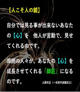 「人こそ人の鏡」 【人こそ人の鏡】 何時も一光堂オフィシャルサイトをご覧いただきまして誠に有難う御座います。 他人が嫌な事を貴方にした場合、必ず貴方も相手にとって嫌な事をしています、其れに気付けたら貴方自身が変われます・・・